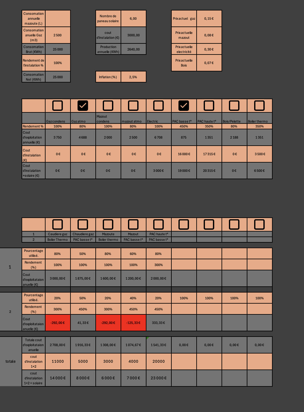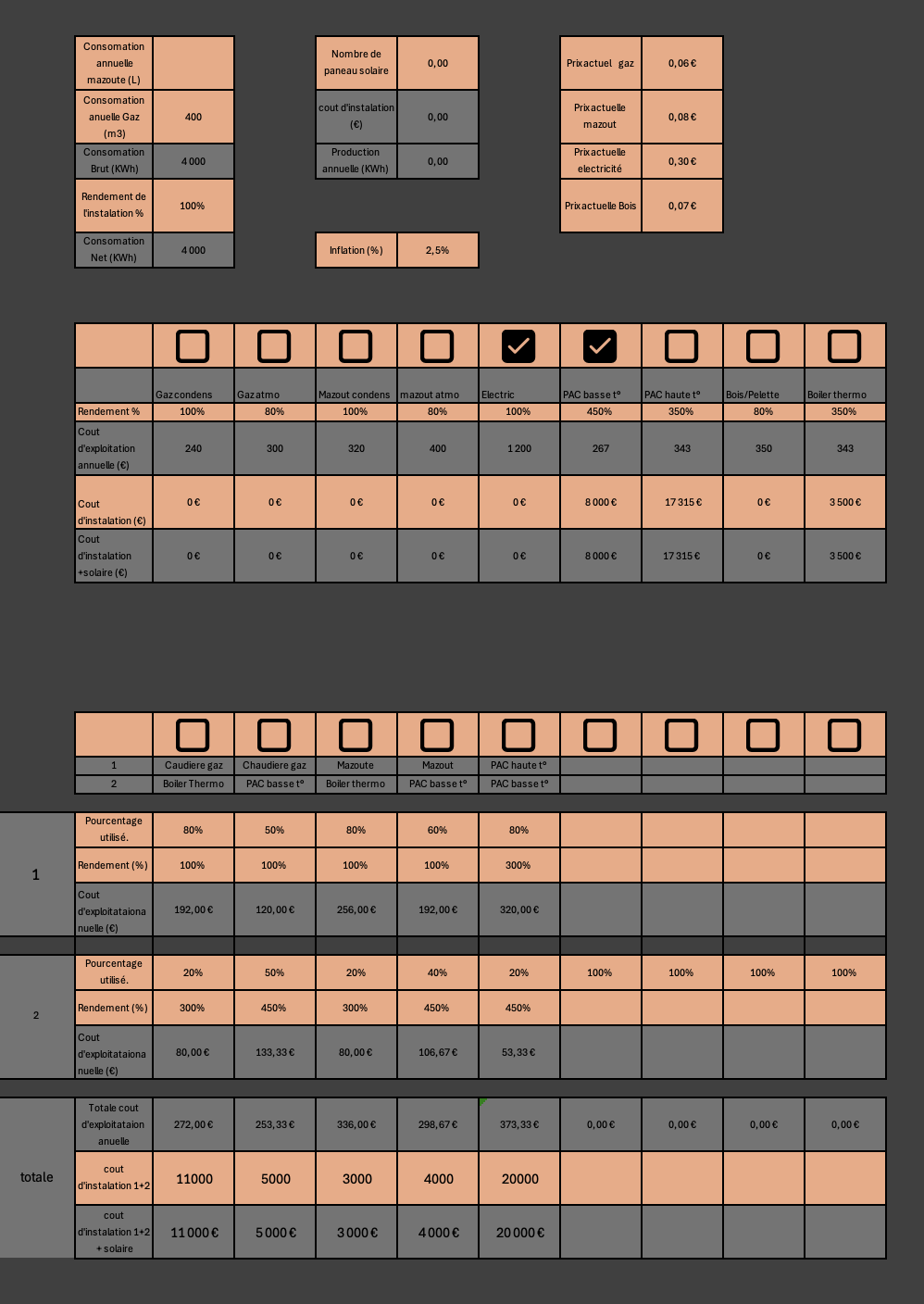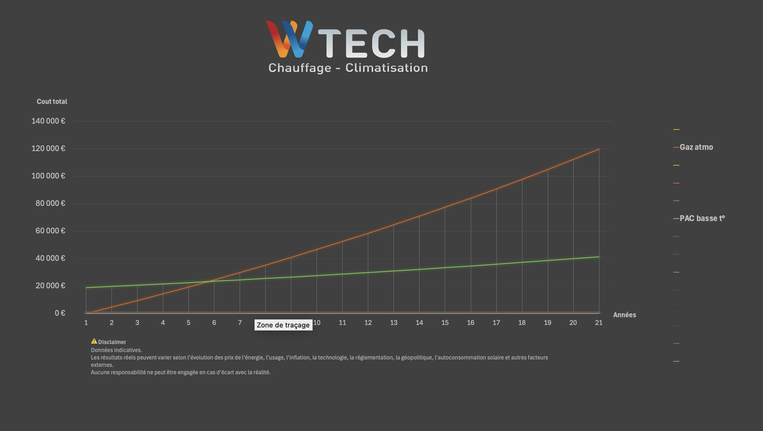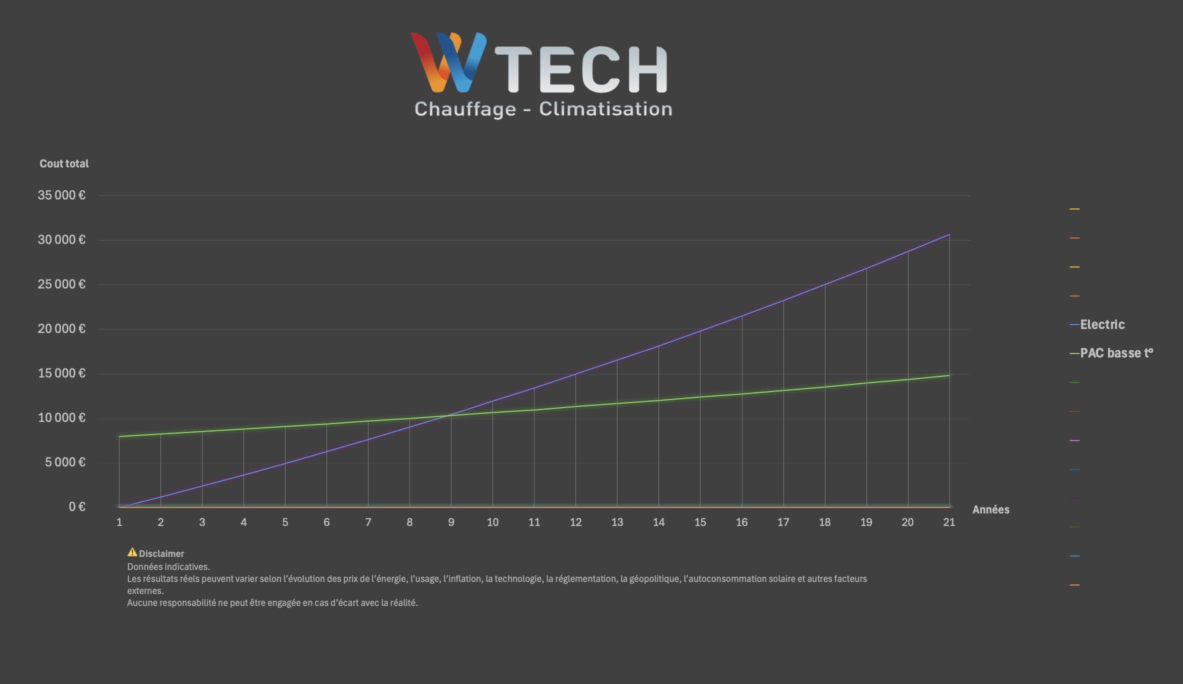 Grâce à notre outil d’analyse comparatif, nous évaluons plusieurs scénarios, en intégrant les coûts d’installation, les performances énergétiques et le prix de l’énergie.