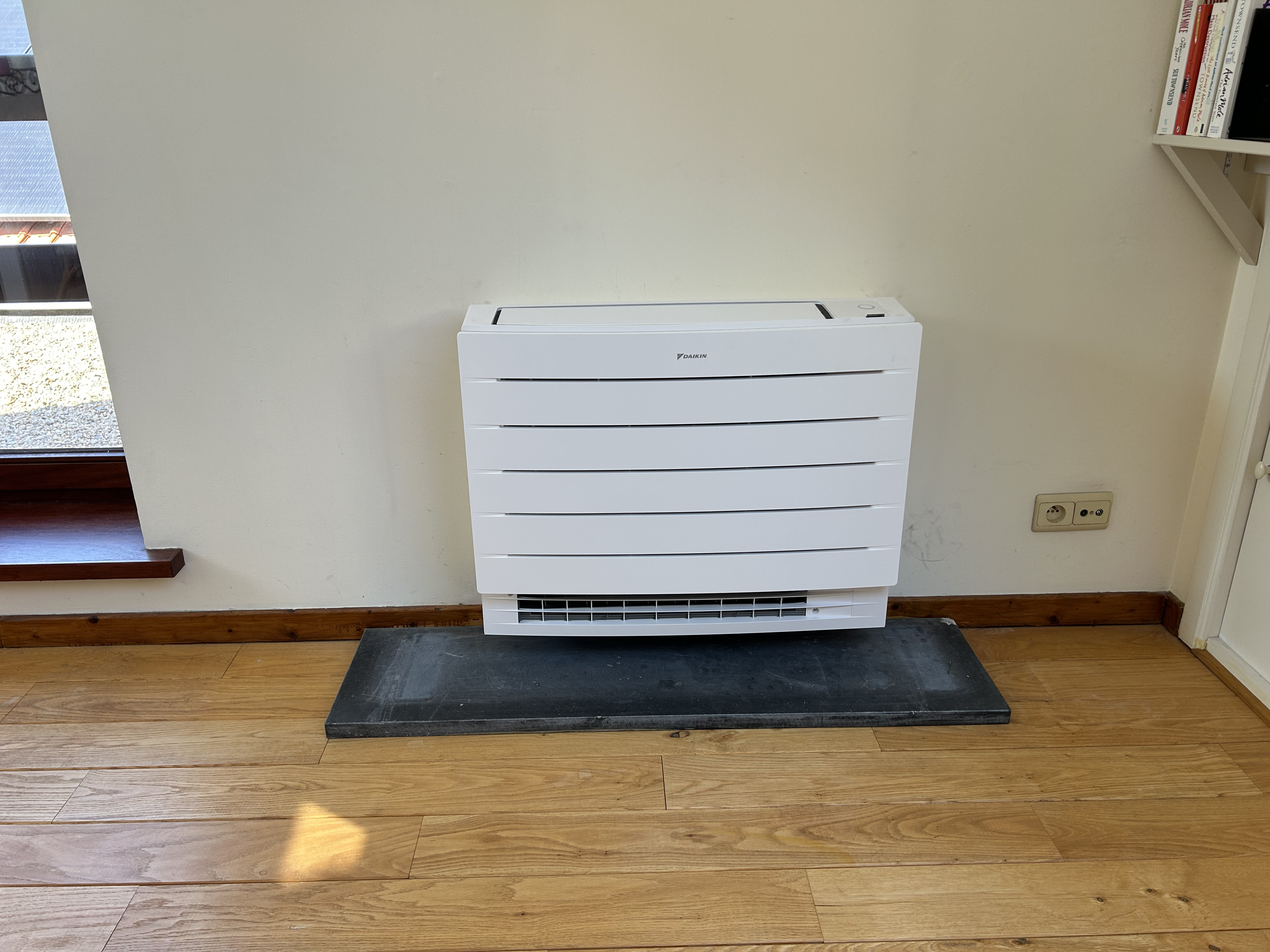 Nous avons installé une unité Daikin Perfera Console, qui diffuse l’air chaud à ras du sol pour un effet comparable à un plancher chauffant, tout en assurant une climatisation efficace en été grâce à la diffusion d’air froid par le haut.